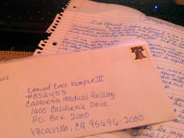 I sent my first letter to convicted serial killer Edmund Kemper a couple of days ago, and I am nervously awaiting his reply -- though I am not getting my hopes up. I've heard that he's very selective in who he corresponds with, so I won't be too shocked if I never hear anything back at all. So I've decided that since my UPS box was $135 for six months (ouch, ouch, ouch) I'm going to write as many prisoners as I can to at least make it worth the money I've paid.