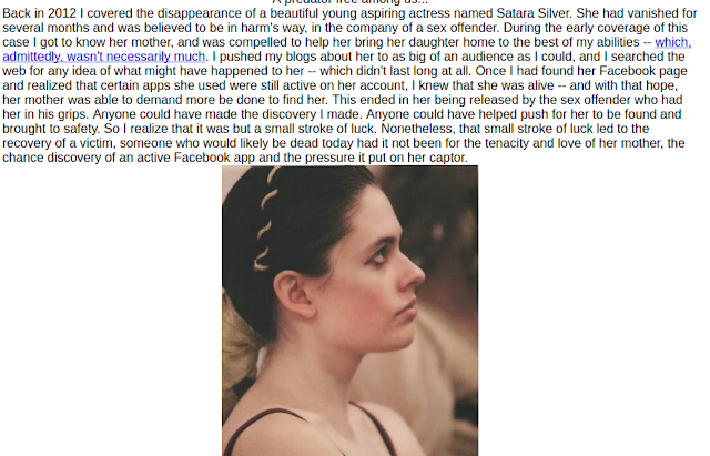 I'm saddened to share with readers of the Case to Case blog, that Satara Stratton has passed away. For those of you who remember her, she was the focus of one of my cases, back in 2012. She had gone missing, and her mother reached out to me. After Satara was found, she had a long road of recovery ahead of her, and I have been there to watch her along that path with hopes that she'd continue flourishing into the talented and ambitious person she was.
